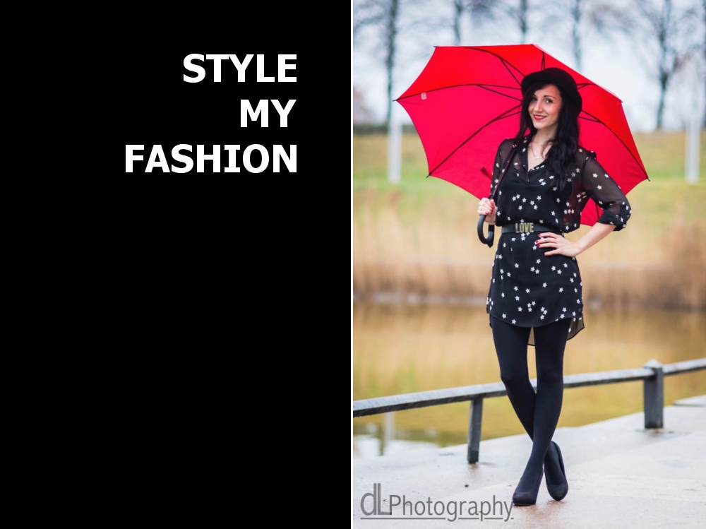 Ganz in schwarz, aufgepeppt mit Sternchen und rotem Schirm. Für mehr Outfitdetails, besucht meinen Blog: